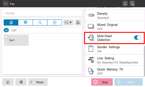 Seleccionar la opción [Func. detec.aliment.múltiple] en Act. detiene el escaneado cuando la máquina detecta que se ha multiplicado el original en la ADF.