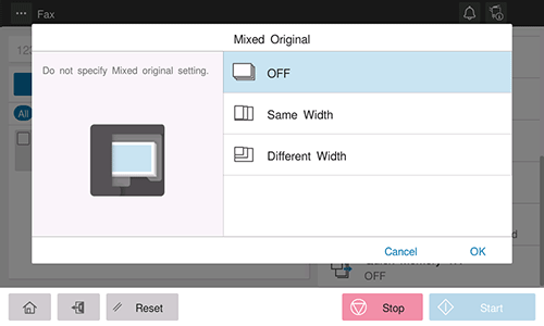 Incluso en originales con páginas de distintos tamaños, utilizando el ADF puede escanear datos mientras se detecta el tamaño de cada página. Si los originales tienen el mismo ancho, seleccione [Mismo ancho]. Si los originales tienen anchos, diferentes, seleccione [Diferente ancho].