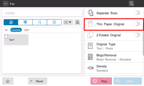 Al escanear un original más fino que el papel normal en el ADF, ajuste esta opción en ON. Esta función reduce la velocidad de alimentación de los originales de la ADF para evitar que el papel fino se quede atascado.
