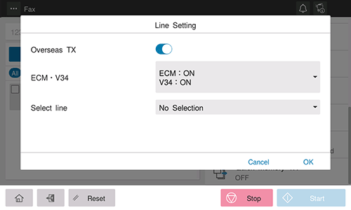 [Seleccionar línea] | Si se utilizan varias líneas, seleccione la línea utilizada para enviar un fax. Para el uso general, utilice la [línea 1]. Si se ha seleccionado [Ninguna], se utilizará cualquier línea que no esté ocupada para la transmisión. |