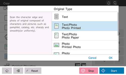 [Texto/foto - Foto impresa] | Permite copiar un original que conste de texto y fotos, con la máxima calidad de imagen. Esta función acentúa los bordes de cada carácter y reproduce fotos más suaves. Seleccione esta opción para escanear originales impresos como, por ejemplo, folletos y catálogos. |
