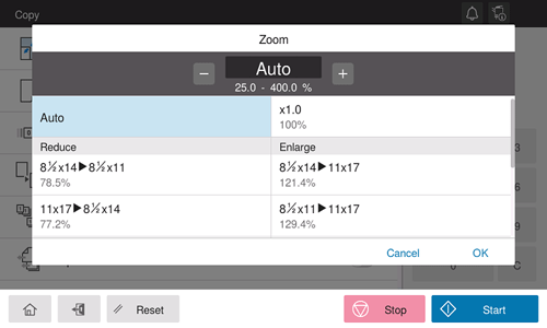 Zoom fijo | Seleccione un factor de escala predefinido para copiar un original de tamaño normal en papel de tamaño normal. La bandeja de papel se cambia automáticamente en función del factor de escala elegido. |