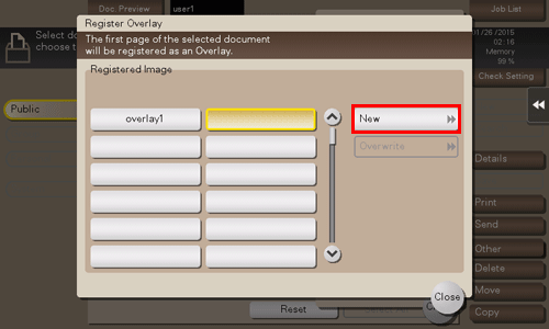 Una vez registrada, es posible componer una imagen de superposición en el original y copiarla seleccionado [Aplicación] - [Superposición registrada] en el modo copia de estilo clásico. Además, al imprimir un archivo desde una carpeta de usuario, es posible componer una imagen de superposición al archivo e imprimirla seleccionando [Aplicación] - [Superposición registrada].