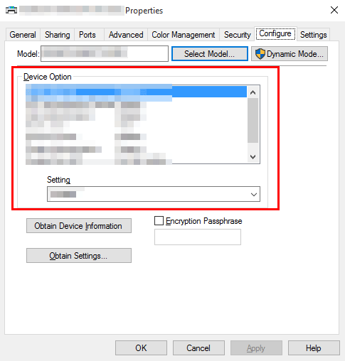 Si la comunicación con esta máquina falla, configure las [Opciones dispositivo] manualmente. Seleccione un elemento que se debe cambiar de la lista y ajuste un valor en [Config.]