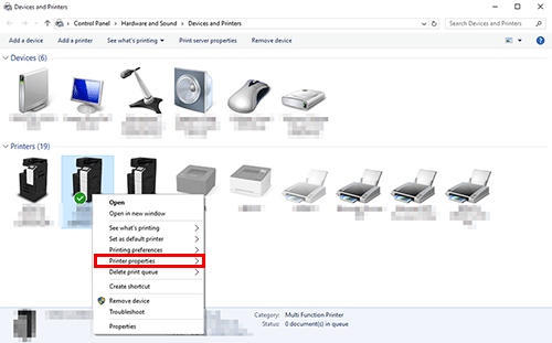 Haga clic con el botón derecho del ratón en el icono de la impresora instalada y, a continuación, haga clic en [Propiedades de impresora].