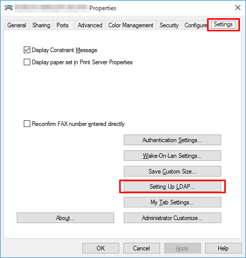 Abra la ficha [Configuración] y seleccione [Confg servidor LDAP...].