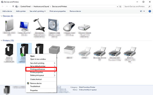 Haga clic con el botón derecho en el icono de la impresora instalada y seleccione [Preferencias de impresión].