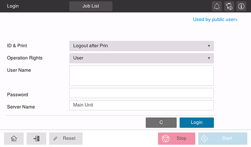 Si el acceso de usuario público (usuarios no registrados) está activado, puede tocar [Usado por un usuario público] en la pantalla de inicio de sesión para utilizar la máquina sin autenticación.