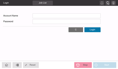 Si está activado el seguimiento de cuentas en la máquina, se visualiza la pantalla de inicio de sesión. Introduzca el nombre de cuenta y la contraseña para habilitar el seguimiento de cuenta.