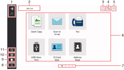4 | Icono de información sobre dispositivo | Es posible comprobar la fecha y la hora actuales, el espacio libre en la memoria y el nivel de tóner. La información sobre dispositivo se muestra cuando: