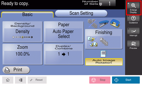 Esta función configura un diseño de pantalla centrado en las funciones utilizadas con frecuencia, lo que permite que un usuario que tiene dificultad para visualizar la pantalla normal pueda realizar operaciones fácilmente. Para volver a la pantalla normal, vuelva a tocar [Ampliar visualización].