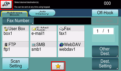 [Fax] | Visualiza la pantalla principal en modo de fax. El modo fax solo proporciona funciones de fax para las funciones que están disponibles en el modo de escanear/enviar por fax Este modo permite recuperar con rapidez la función de destino al utilizar el fax. El modo fax tiene las características siguientes.