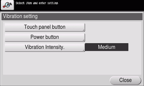 [Intensidad de la vibración] | Permite especificar la intensidad de la vibración cuando se pulsa una tecla en el panel táctil o la tecla Energía (predeterminado: [Medio]). Si toca la tecla de configuración de intensidad de la vibración, puede confirmar la intensidad que se debe aplicar. |