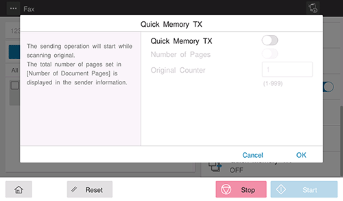 Asigne a [Especificar el número de originales] el valor ON e introduzca el número total de páginas del original en [Número de originales].