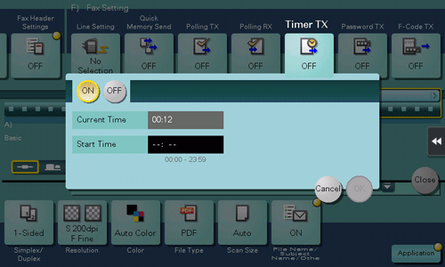 Toque [Aplicación] - [Config. fax] - [Transmisión de temporizador] y toque [ON].