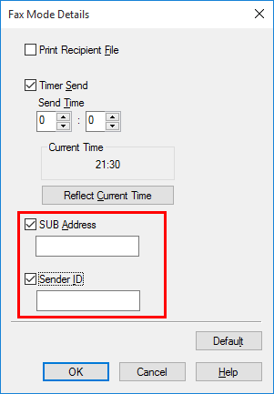[Cargar información de configuración] | Introduzca la información que ha configurado en los campos [Empresa], [Departamento], [Nombre] y [Nº de fax] (utilizando 80 caracteres como máximo para cada entrada). Puede seleccionar esta opción si se ha añadido un destinatario a la [Lista de destinatarios] de la pantalla [Ventana emergente transmisión fax].