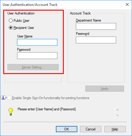 Con la autenticación de usuario activada, seleccione [Usuario destinatario] y, a continuación, introduzca el nombre de usuario y la contraseña.