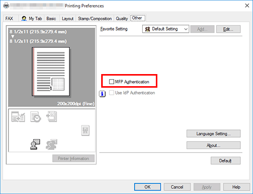 Para llevar a cabo la autenticación MFP cuando se utiliza conjuntamente con la autenticación con servidor externo, seleccione la casilla de verificación [MFP Autentificación] en la ficha [Otros].