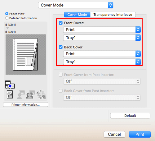 En [Cover Mode], seleccione las casillas de verificación [Front Cover from Post Inserter:] y [Back Cover from Post Inserter:].