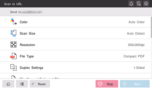 Para enviar después de cambiar la configuración de opciones, toque el icono del menú de la parte superior de [Escanear a URL] y continúe en el paso 4.
