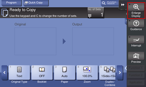This function configures a screen layout focused on commonly used functions, enabling a user who has difficulty viewing the normal screen to easily perform operations. To return to the normal screen, tap [Enlarge Display] again.