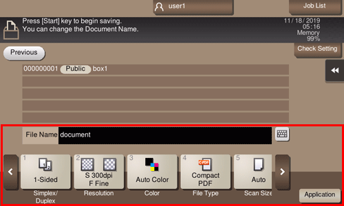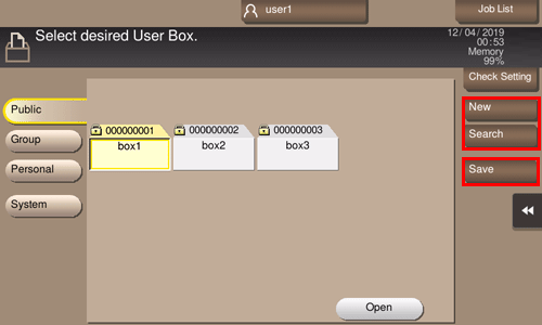 This example uses the Public User Box for explanatory purposes. To use a Personal User Box or a Group User Box, tap [Personal] or [Group], and select the desired User Box.