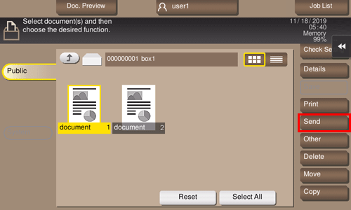 This example uses the Public User Box for explanatory purposes. To use a Personal User Box or a Group User Box, tap [Personal] or [Group], and select the desired User Box.