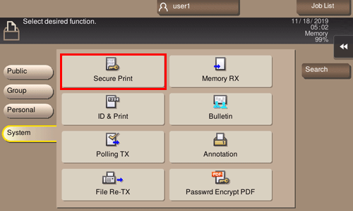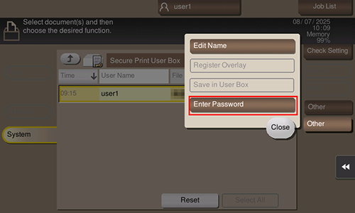 If [Prohibit Functions] is set to [Mode2] in [Utility] - [Administrator] - [Security] - [Security Details] - [Prohibit Functions], you need to also enter the password when selecting a file from the Secure Print User Box. You need to enter the password for each file even if secure documents have the same document ID. Therefore, the security level is higher than that of default [Mode1].