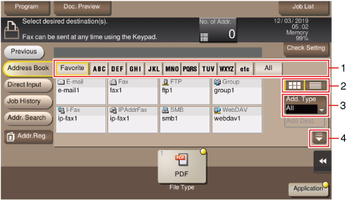 2 | Switches the display of the registered destinations to the button or list view mode. If the list view mode is selected, you can sort destinations by registration number, destination type, or registered name. |