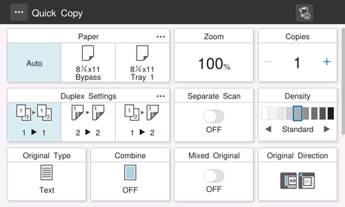 The Quick Copy screen displays setting items of the copy function in the card format. You can tap the target card to change the setting. When you want to select a setting other than the displayed three options in an item that provides three options such as [Paper] and [Duplex Settings], tap the Detail icon (