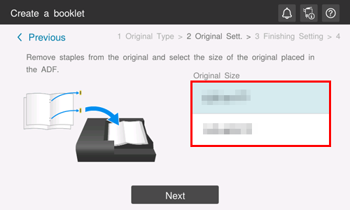 Copy the unstapled book original ([Booklet]) to create a booklet.