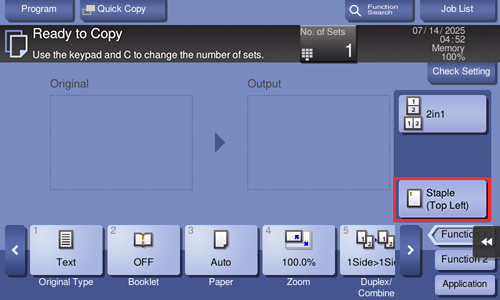 You can arrange a key (finishing program), in which a combination of finishing settings is registered, on the main screen in copy mode of classic style. If you arrange the frequently used combination of finishing settings as a recall key on the main screen, it will be useful to specify the setting with a single key action.