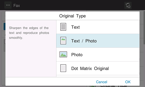 [Dot Matrix Original] | Scans an original, which consists primarily of text such as thin or faint characters, at the optimum image quality level. This function reproduces text using high pixel density, creating easy-to-read text. |