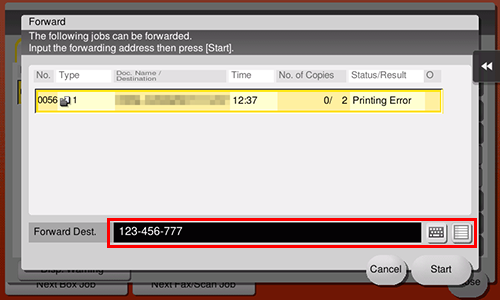 You can either directly enter a forwarding destination by tapping the input area or the keyboard icon, or select one from destinations registered in the machine by selecting the list icon.
