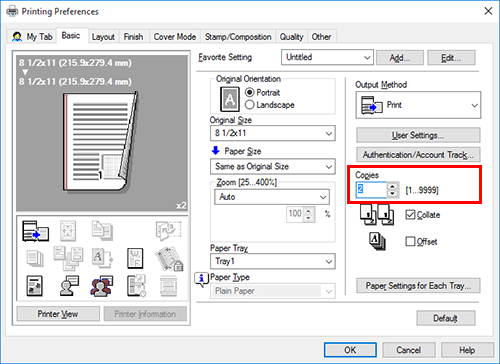 In [Copies] in the [Basic] tab, specify the number of copies you want to print.