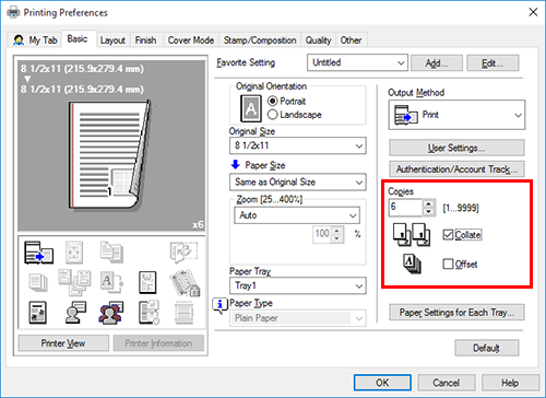 When the [Collate] check box is selected in the [Basic] tab, copies are output separately in a set-by-set manner, for example, "12345", "12345", and "12345". When the [Offset] check box is selected, the output position is staggered one by one.