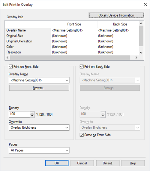 [Print on Front Side]/[Print on Back Side] | Select this check box to compose an overlay image on the front and back sides. In addition, specify how to compose an overlay image. | |
