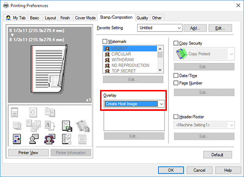 In [Overlay] in the [Stamp/Composition] tab, select [Print Host Image] or [Print Device Image] (PCL only), and then from the list, select the overlay image to be printed on the original as a composite image.