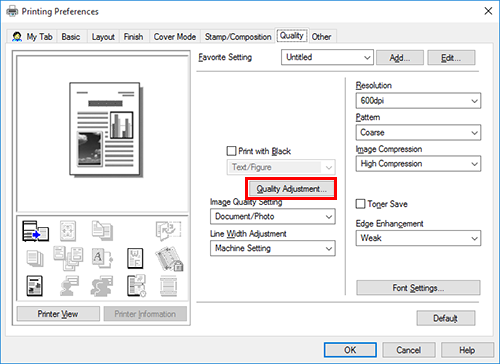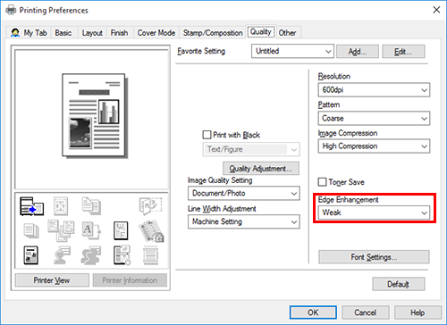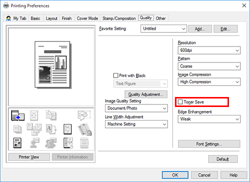 Selecting the [Toner Save] check box in the [Quality] tab adjusts the printing density in order to save the amount of toner consumed.