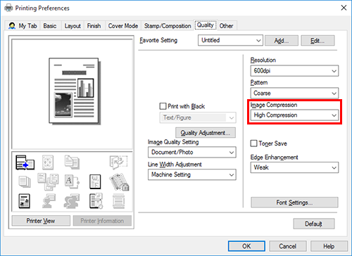 In [Image Compression] in the [Quality] tab, select whether the quality or printing speed is preferred when the image data contained in the original is compressed.