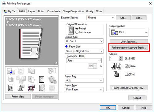 To use User Principal Name, change [User Name] of [User Authentication] to [Select default setting] or [Lock setting] in [Administrator Customize] of the [Settings] tab on the [Printer properties] screen of the printer driver, and select [Use User Principal Name] (default: [Use Windows Login ID]).