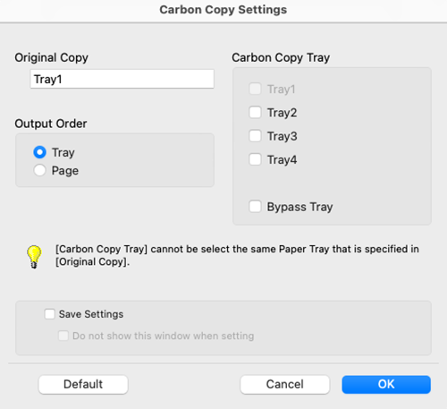 [Save Settings] | When the Save Setting check box is selected, the settings are saved. When the [Do not show this window when setting] check box is selected, this dialog box is not displayed when [Carbon Copy] is enabled. Using this function, you can save steps to configure settings the next time and after if you always specify the same carbon copy tray settings to execute a print job. |