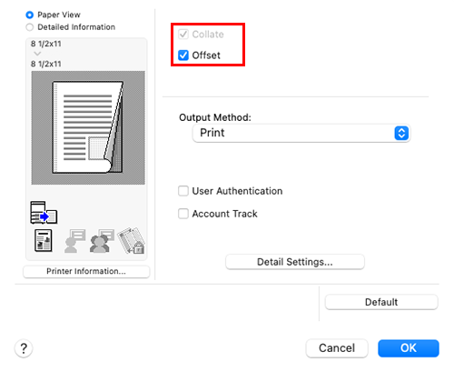 When you select both [Collate] and [Offset] check boxes, the output position is staggered for each set, allowing you to easily prepare handouts.