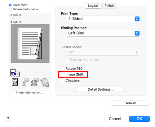 You can fine tune the image position by shifting it in a horizontal or vertical direction according to the paper size. When an image is printed on the back side, you can also fine tune its position.