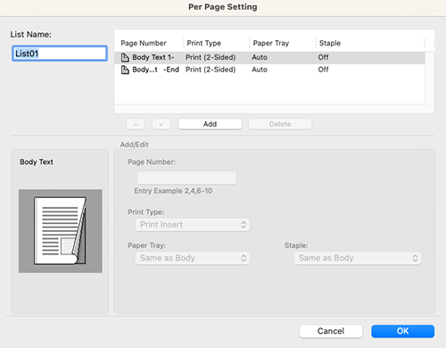 Create in advance a list that specifies the paper and print settings for each page. When printing on inserted paper, select the list you want to apply to printing.