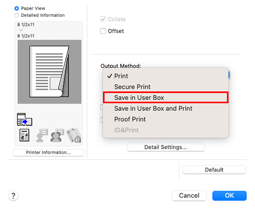 The Save in User Box function saves print data in a User Box on this machine. You can also print the data at the same time as it is being saved in the box.
