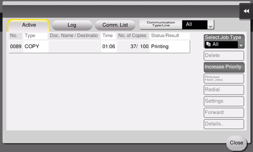 Tap [Log] to display a list of jobs processed on this machine up till then. You can check a job that could not be ended due to an error.