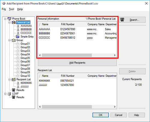 When you click [Search...], you can set a condition to make a search. The search results are displayed in the [Personal Information] list. For details, refer to Search for destination.