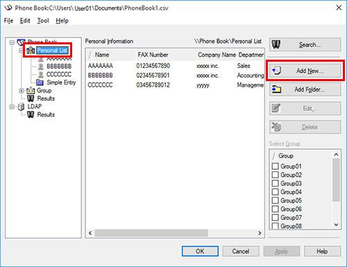 The personal information is registered and displayed under [\\Phone Book\Personal List]. If you have selected groups for the recipient, it will be displayed in the groups list.