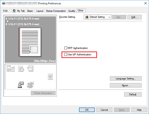 Make sure that [IdP Authentication Setting] is set to [Enable] or [Enable (Give priority IdP authentication)] in [Device Option] on the [Configure] tab of the fax driver (default: [Disable]). For details on [Device Option], refer to Configuring the optional environment of this machine.
